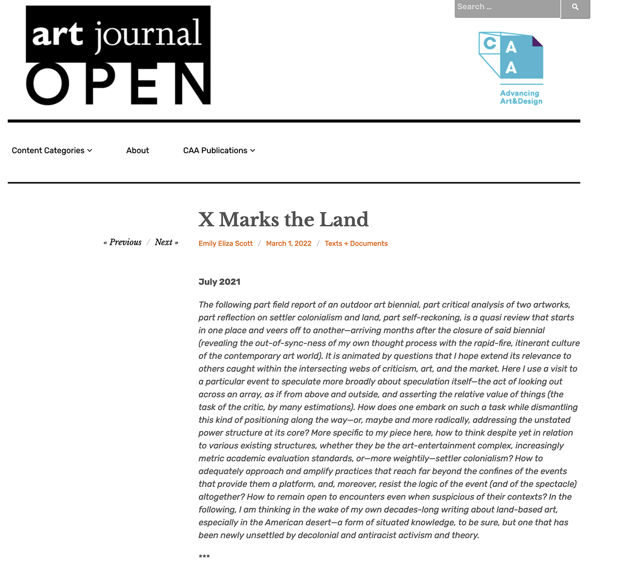 Emily Eliza Scott’s in-depth examination of Desert X 2021, which I participated last year, is now published in Art Journal Open. Like all of Emily’s deeply considered essays focused on the American desert this piece illuminates an array of timely issues related to Land Art, land politics, but most importantly settler colonialism in the context of contemporary art and landscape. I’m very honored to have such an important critical voice discuss Jackrabbit Homestead alongside Nicholas Galanin’s Indianland DX21 installation and the work of Gerald Clarke. Read the essay: https://artjournal.collegeart.org/?p=16566
