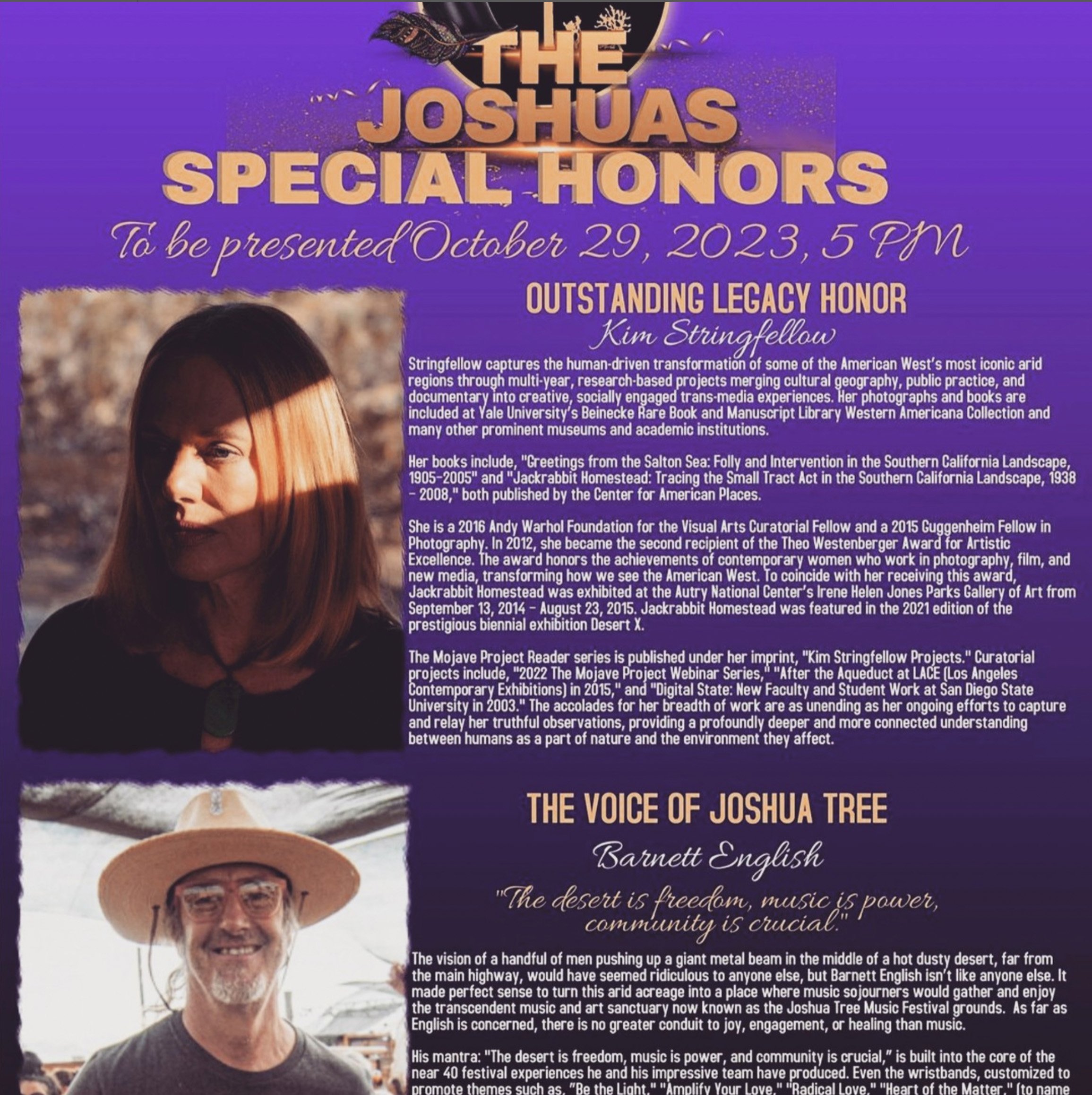Kim Stringfellow is the 2023 recipient of the Joshua Tree Voice Outstanding Legacy Honor. Tickets for the Sunday, October 29th Gala Event are available at the Joshua Tree Voice website for $45. Your ticket benefits the Boys & Girls Club of the Hi-Desert, Joshua Tree National Park Association, and the Joshua Tree Retreat Center (where the event is held).